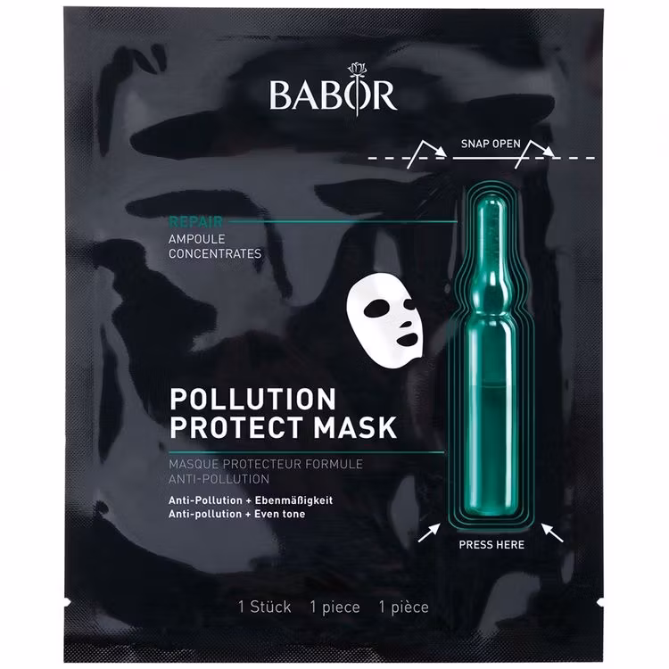 BABOR Ampulle Mask- Pollution protect er en høyeffektiv kombinasjon av Babors unike ampuller og en eksklusiv sheet maske. Når ampullekammeret aktiveres blandes de aktive ingrediensene med sheet masken.
